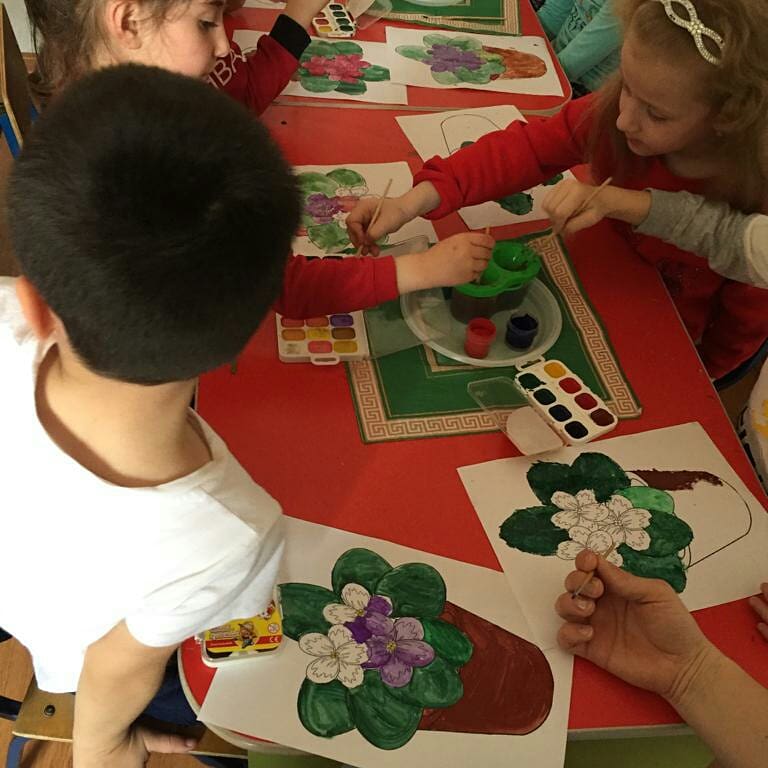 Тема: Фиалка в горшке. Цель: учить детей передавать в рисунке характерные особенности строения растений, соблюдать пропорции деталей.